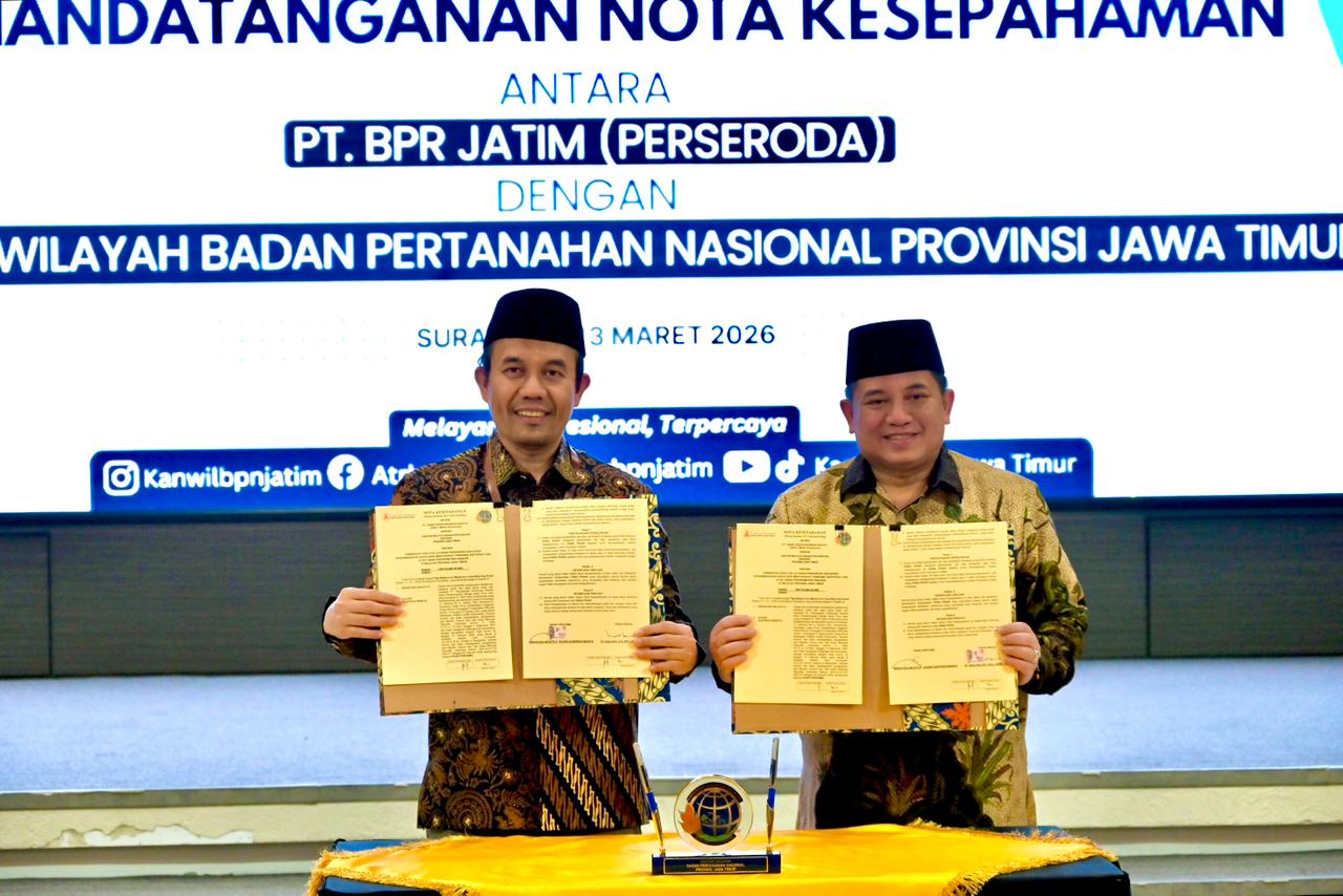 Surabaya – Bank UMKM Jatim (PT BPR Jatim Perseroda) kembali berkolaborasi dengan Kantor Wilayah Badan Pertanahan Nasional (BPN) Jawa Timur dalam mempermudah akses pembiayaan atau modal usaha bagi masyarakat. Kerja sama tersebut ditegaskan melalui penandatanganan Nota Kesepahaman (MoU) di Kantor Wilayah BPN Jawa Timur, Jumat (13/3/2026).